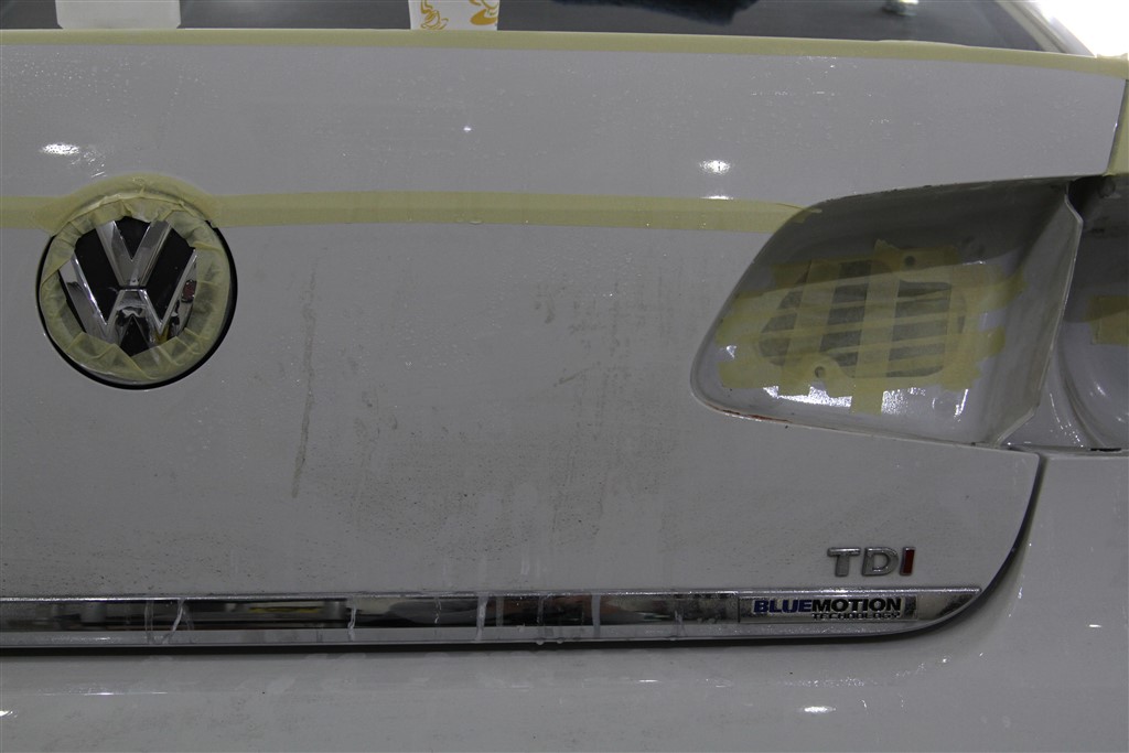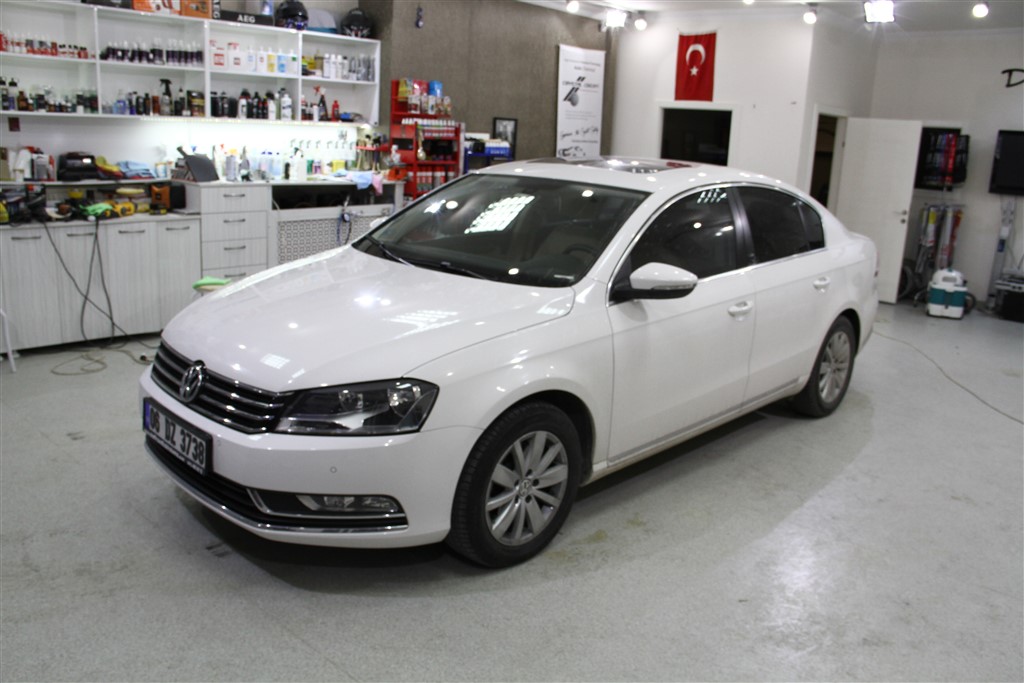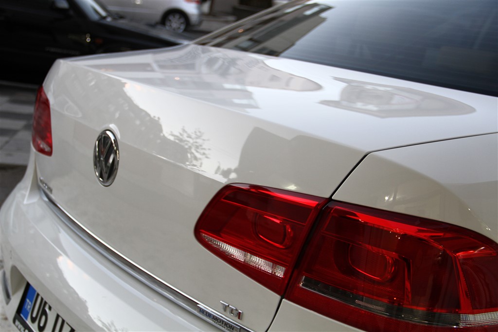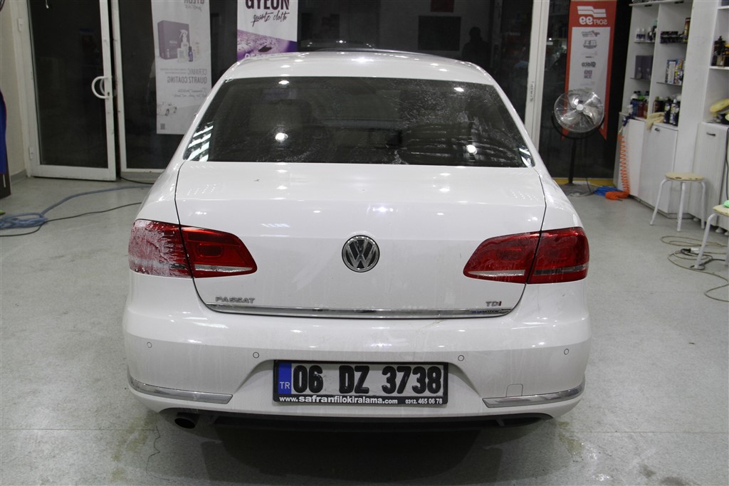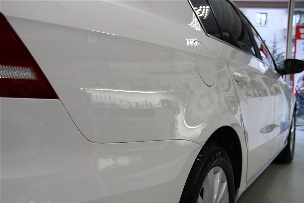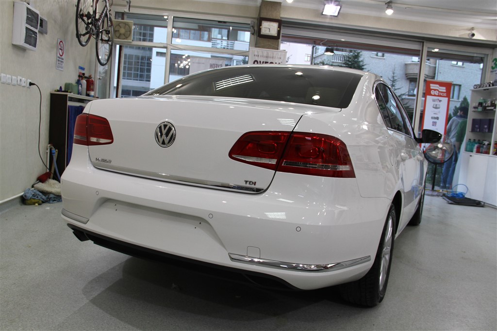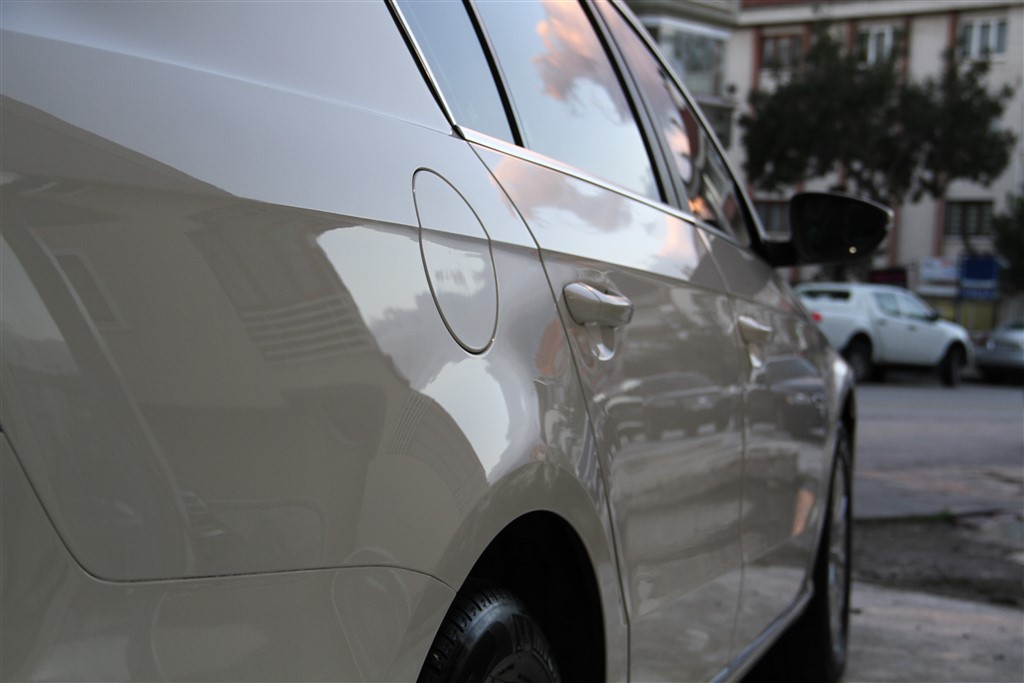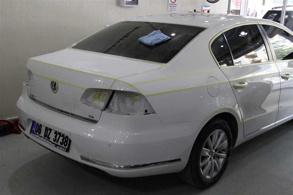 Aracın tavanı uygulama da en çok özen ve hassasiyet gerektiren bölümdü. Bu kısımda uygulamayı aceleye getirmeden yine 1200gritten başlayarak kontrollü inceltmeyle zımparalama işlemlerini yaptık. Volkswagen Passat’ın çamurluklarının şekli sebebiyle en zorlandığımız kısımlardan biri sol arka çamurluktu. Köşe kısımlarda zımpara işlemi yaparken oldukça ince ve hassas şekilde çalışarak, bantları mümkün olduğunca köşeye yakın şekilde çekerek olabilecek en iyi düzeltmeyi yakaladık. Aracın tamamında yaptığımız zımpara ve polisaj işlemlerinden sonra, fabrika çıkışı sıfır kilometre otomobillerde bile sıklıkla görülen portakal kabuğu görünümünü de otomatik olarak gidermiş olduk. Bagaj kapağının altındaki alanda boya kalkmaları meydana gelmişti. Bu alanda gerekli yerleri temizleyip rötüş boyası uyguladık. Bütün bu uygulamaları tamamladıktan sonra, boyadığımız parçaların montajını ve son kontrollerini tamamlayıp aracın koruma işlemlerine hazırlandık.