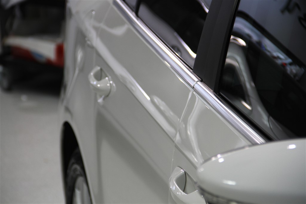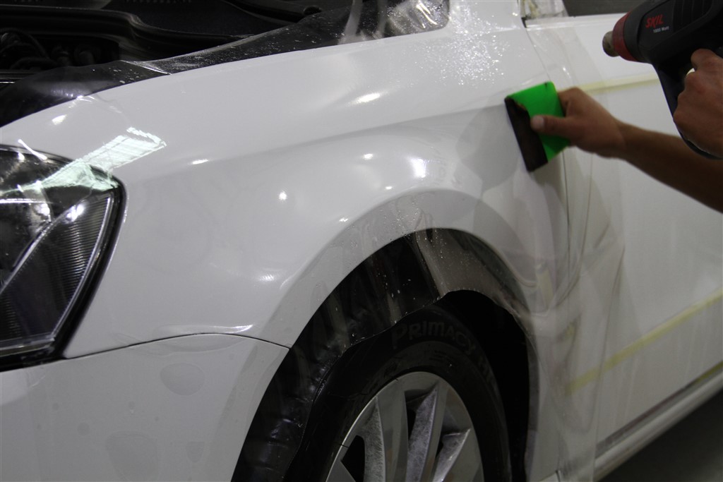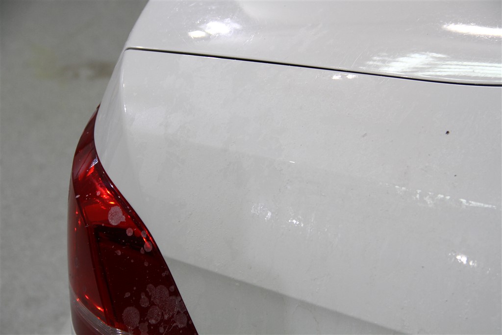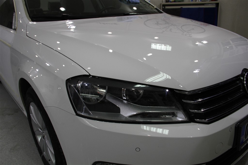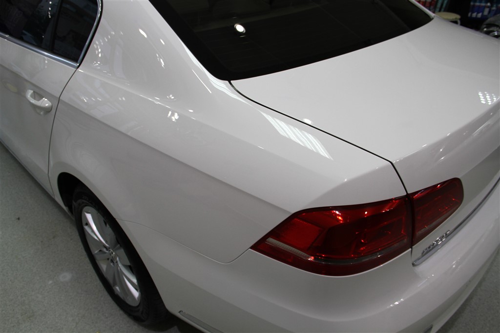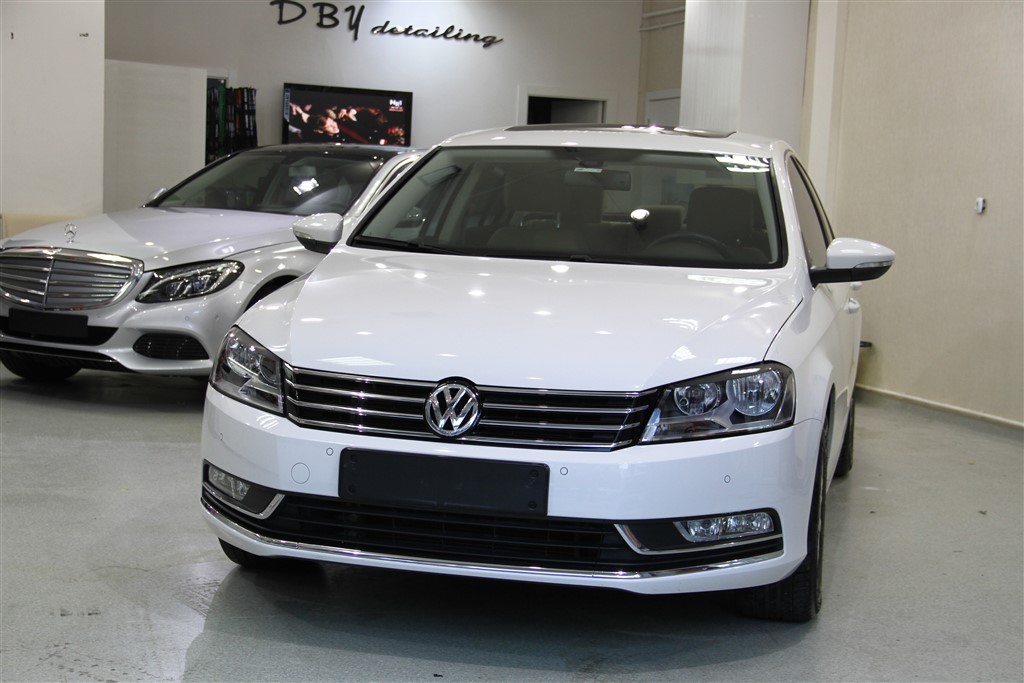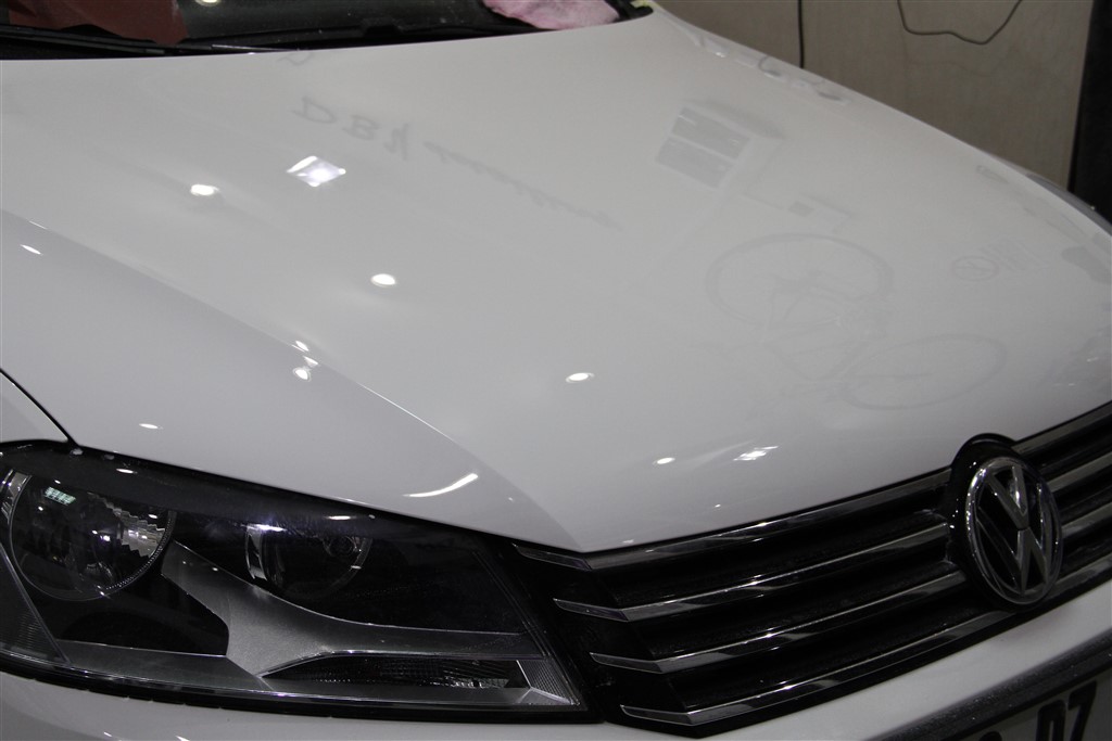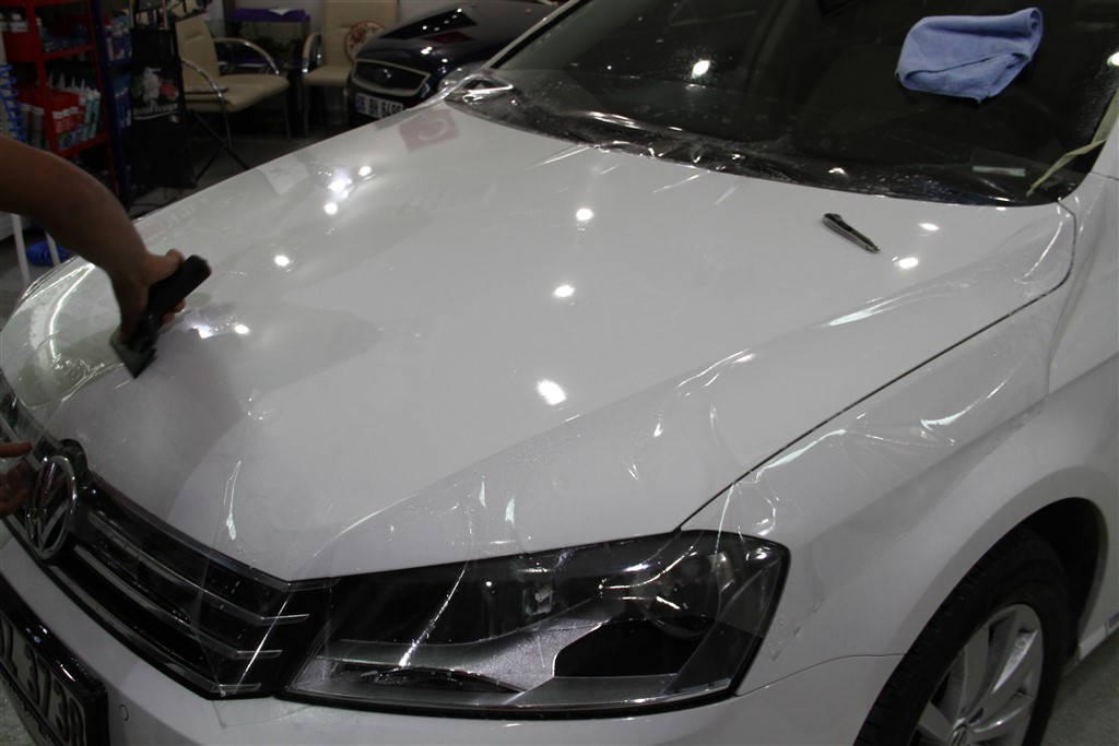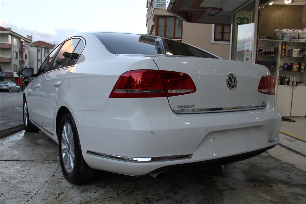 Aracın tavanı uygulama da en çok özen ve hassasiyet gerektiren bölümdü. Bu kısımda uygulamayı aceleye getirmeden yine 1200gritten başlayarak kontrollü inceltmeyle zımparalama işlemlerini yaptık. Volkswagen Passat’ın çamurluklarının şekli sebebiyle en zorlandığımız kısımlardan biri sol arka çamurluktu. Köşe kısımlarda zımpara işlemi yaparken oldukça ince ve hassas şekilde çalışarak, bantları mümkün olduğunca köşeye yakın şekilde çekerek olabilecek en iyi düzeltmeyi yakaladık. Aracın tamamında yaptığımız zımpara ve polisaj işlemlerinden sonra, fabrika çıkışı sıfır kilometre otomobillerde bile sıklıkla görülen portakal kabuğu görünümünü de otomatik olarak gidermiş olduk. Bagaj kapağının altındaki alanda boya kalkmaları meydana gelmişti. Bu alanda gerekli yerleri temizleyip rötüş boyası uyguladık. Bütün bu uygulamaları tamamladıktan sonra, boyadığımız parçaların montajını ve son kontrollerini tamamlayıp aracın koruma işlemlerine hazırlandık.