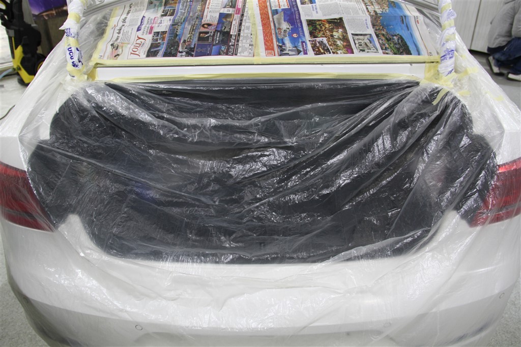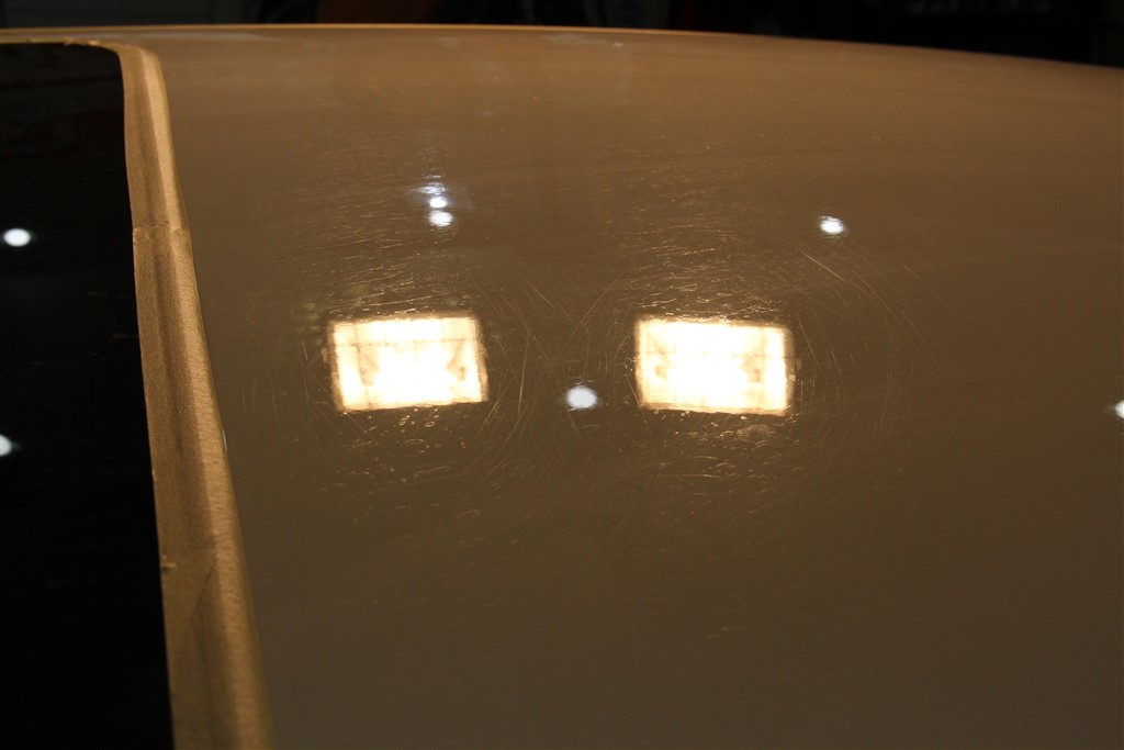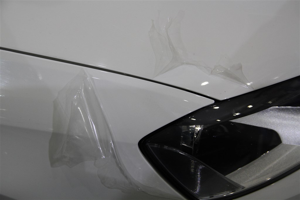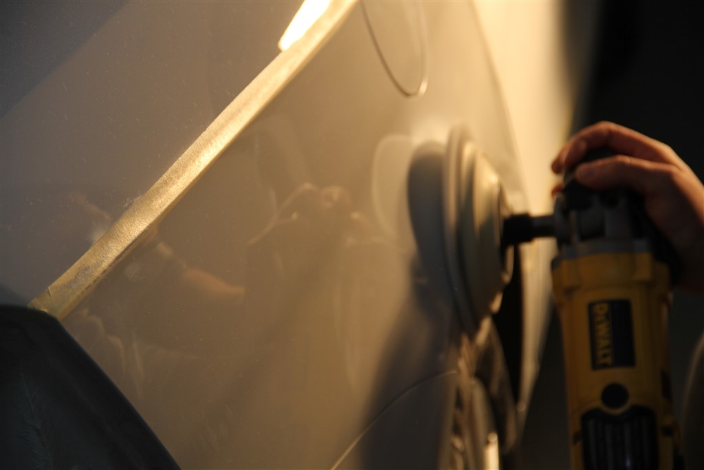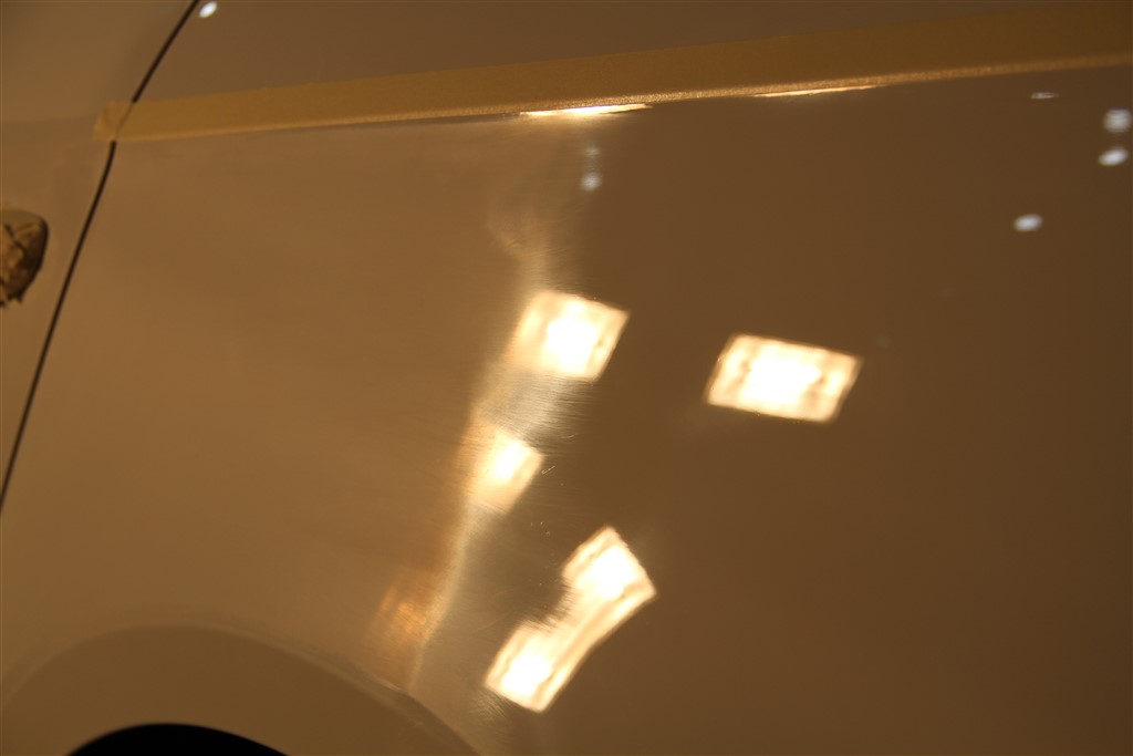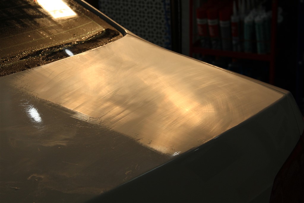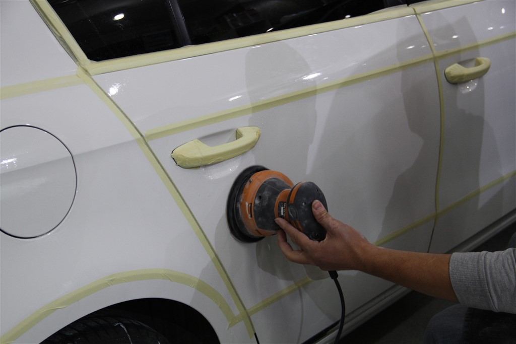 Yan panellerde deformasyon daha çok akıntı şeklinde olduğundan ve paneller daha düz olduğundan 1000grit Disk zımpara kullanarak işlemlere başladık. Ardından bagaj kapağında olduğu gibi 1200-1500-2000-2500-3000grit zımparalar ile zımparalayıp polisaja hazır hale getirdik. Yaklaşık 20-25 saat civarında süren işlemlerde aracın çıkıntı yapan köşe kısımlarını Tesa Maskeleme Bantları ile bantlayıp zımparanın o bölgelerde sebep olabileceği açılmaları olabildiğince engelledik. Kaput ve ön çamurluklarda bulunan koruma filmi de deforme olmuştu. Ayrıca filmin altında kalan boya da deforme olmuştu. Bu eski filmleri sökerek, çamurluk ve kaput bölgesine de zımpara işlemleri yapıldı. Ardından kaput ve çamurluk koruma filmini Llumar PPF Gloss Şeffaf Koruma Filmi ile yeniledik. Zımparalama işlemlerinin ardından kapı içi döşemeleri sökülüp; Aynalar ve yan çıtalar sökülerek boya için hazırlandı. Yüzeylerinde ciddi deformasyonlar oluşan plastik aksamları tertemiz ve sıfır görünüm için boyamak durumunda kaldık.